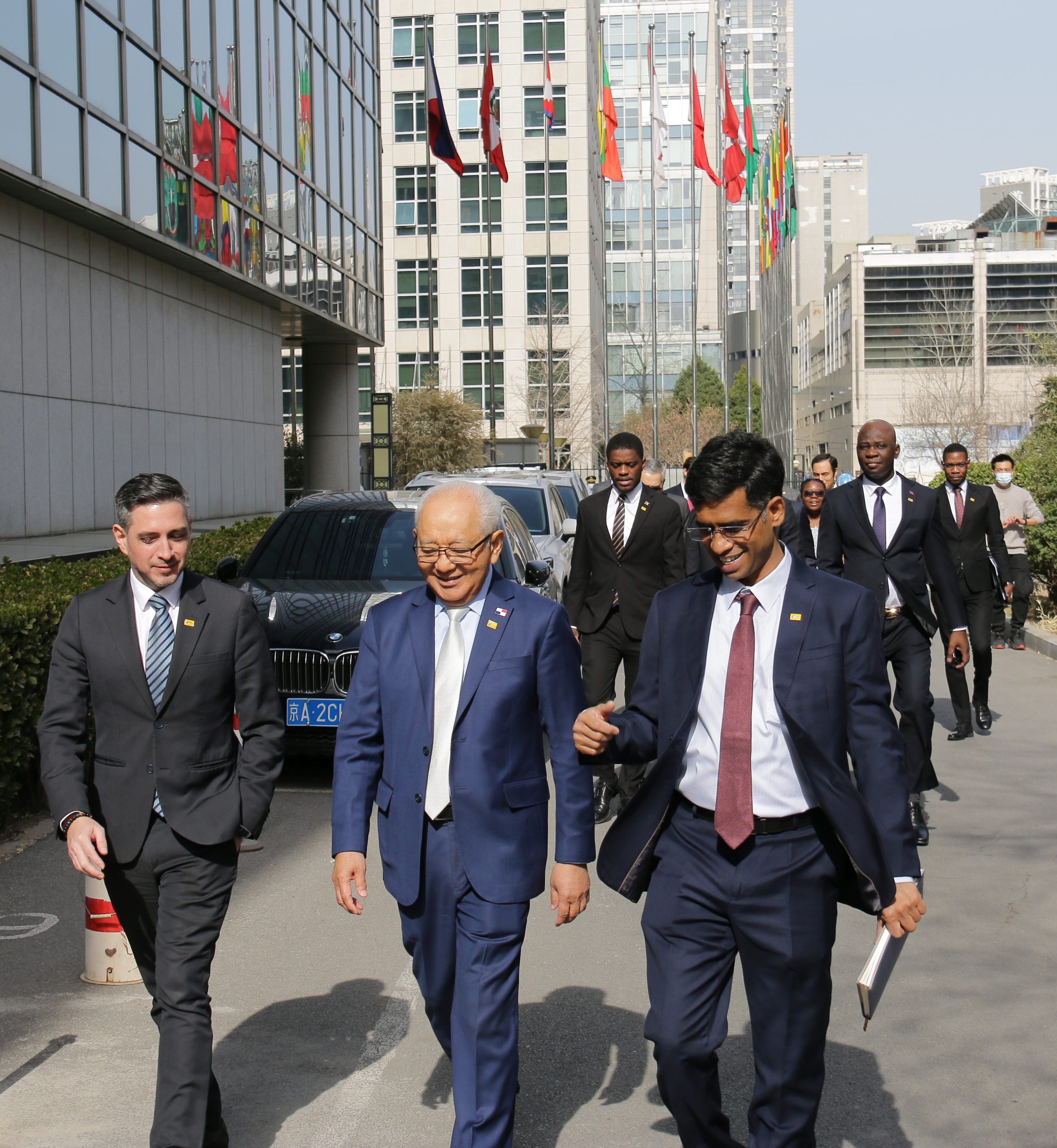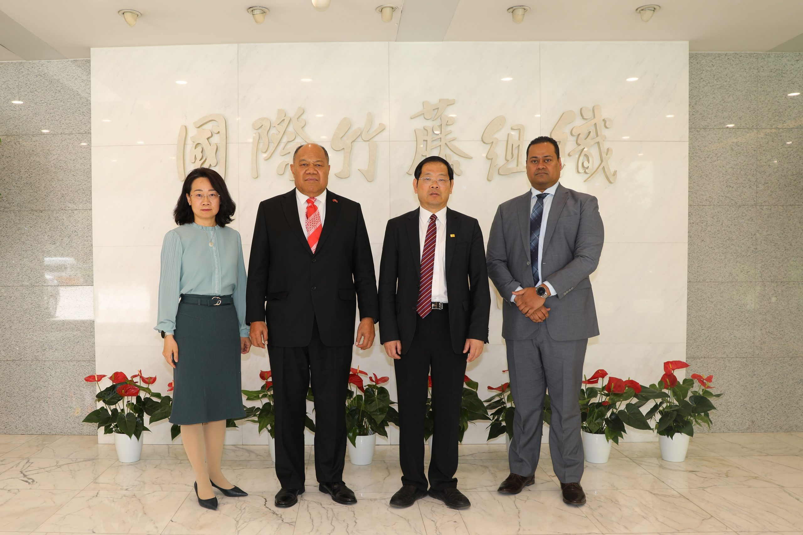 H.E. Mr. Tauaika Utaatu, Ambassador of Tonga to China (middle, left) meets with INBAR Deputy Director General Lu Wenming (middle, right) at INBAR HQ.