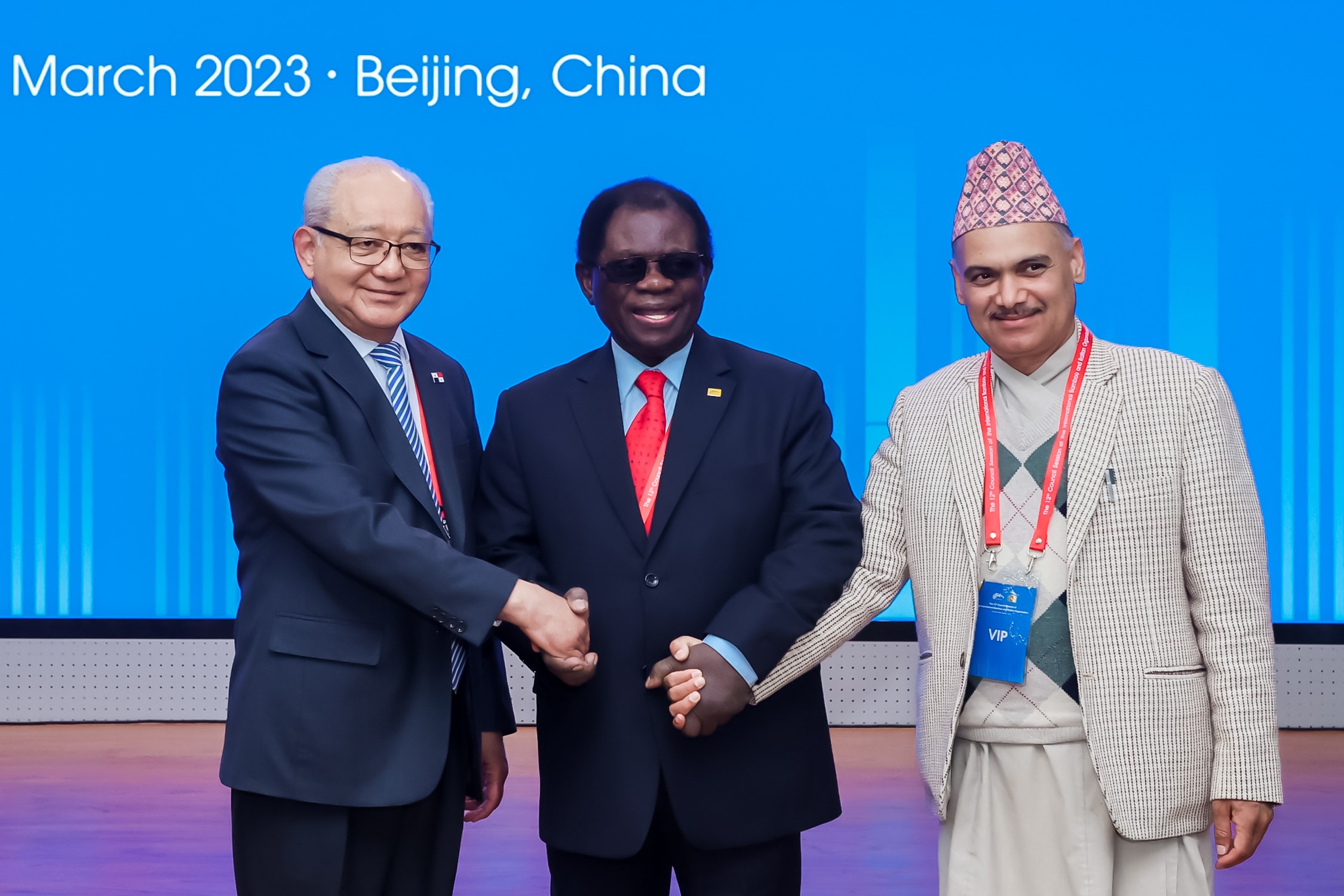 INBAR DG Ali Mchumo (middle) congratulates new INBAR Council Chair H.E. Yam Prasad Pokharel, Nepal (right) and Vice-Chair H.E. Leonardo Kam, Panama (left).