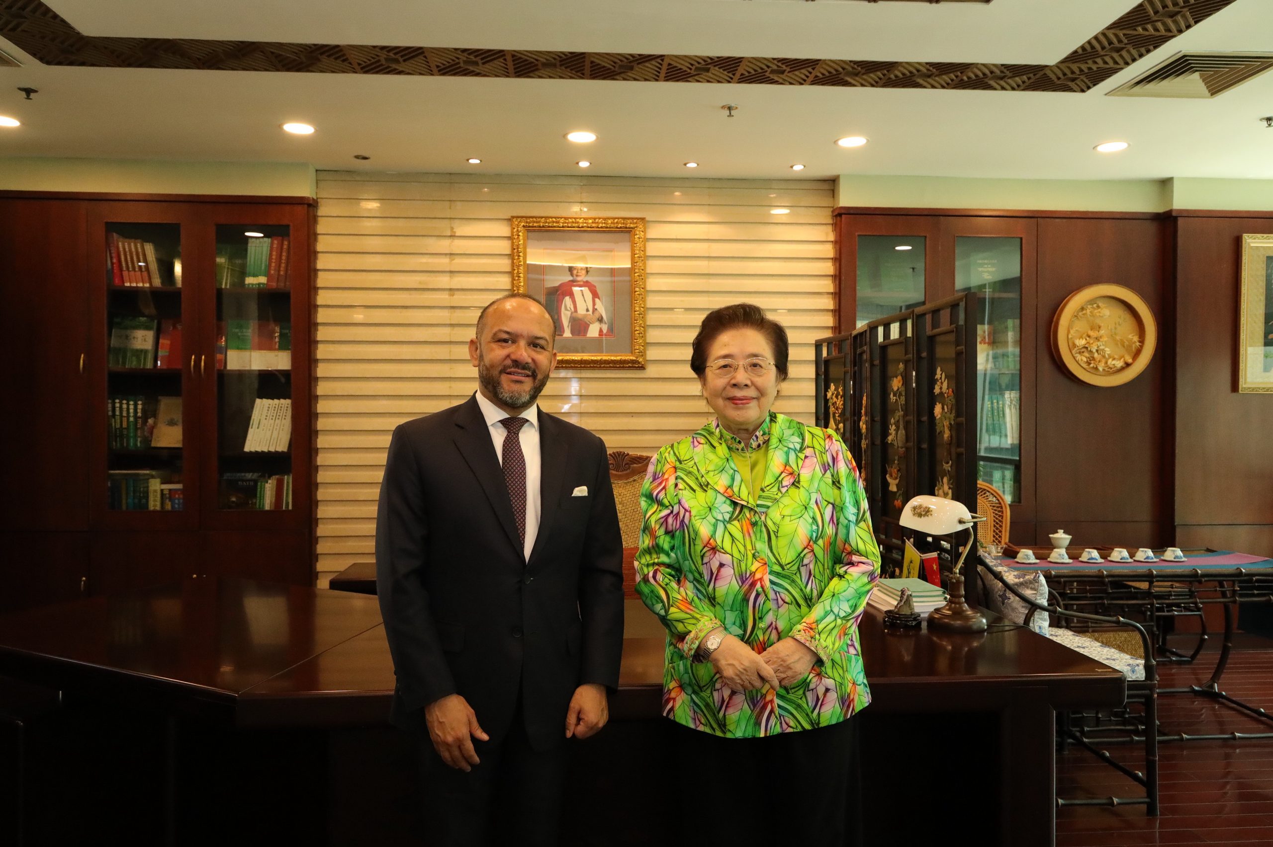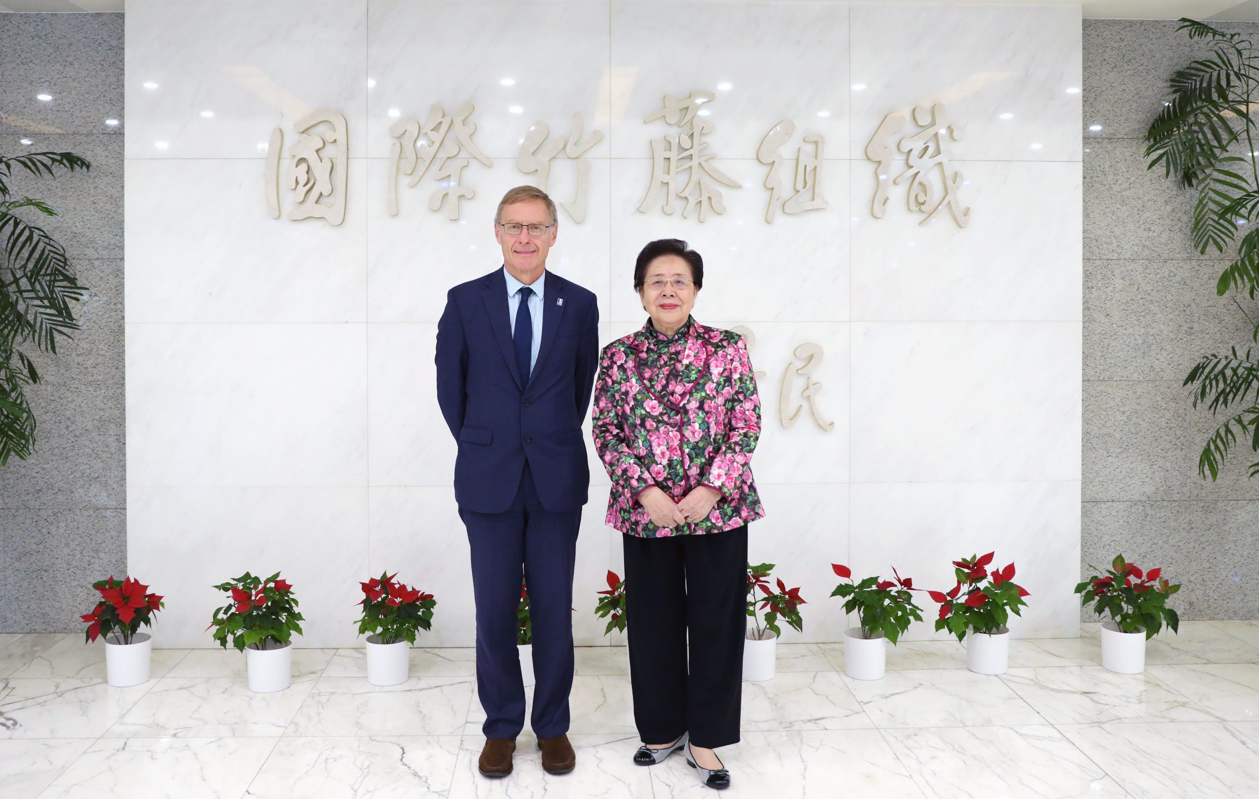 H.E. Briunny Garabito Segura, Ambassador of the Dominican Republic, meets with Professor Jiang Zehui, Co-Chair of the INBAR Board of Trustees, at INBAR HQ.