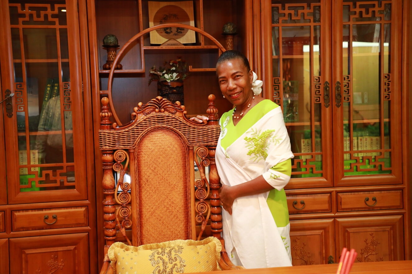 H.E. Ms. Sophie Ratsiraka, Minister of Crafts of the Republic of Madagascar, visits the showroom at INBAR Headquarters in Beijing.