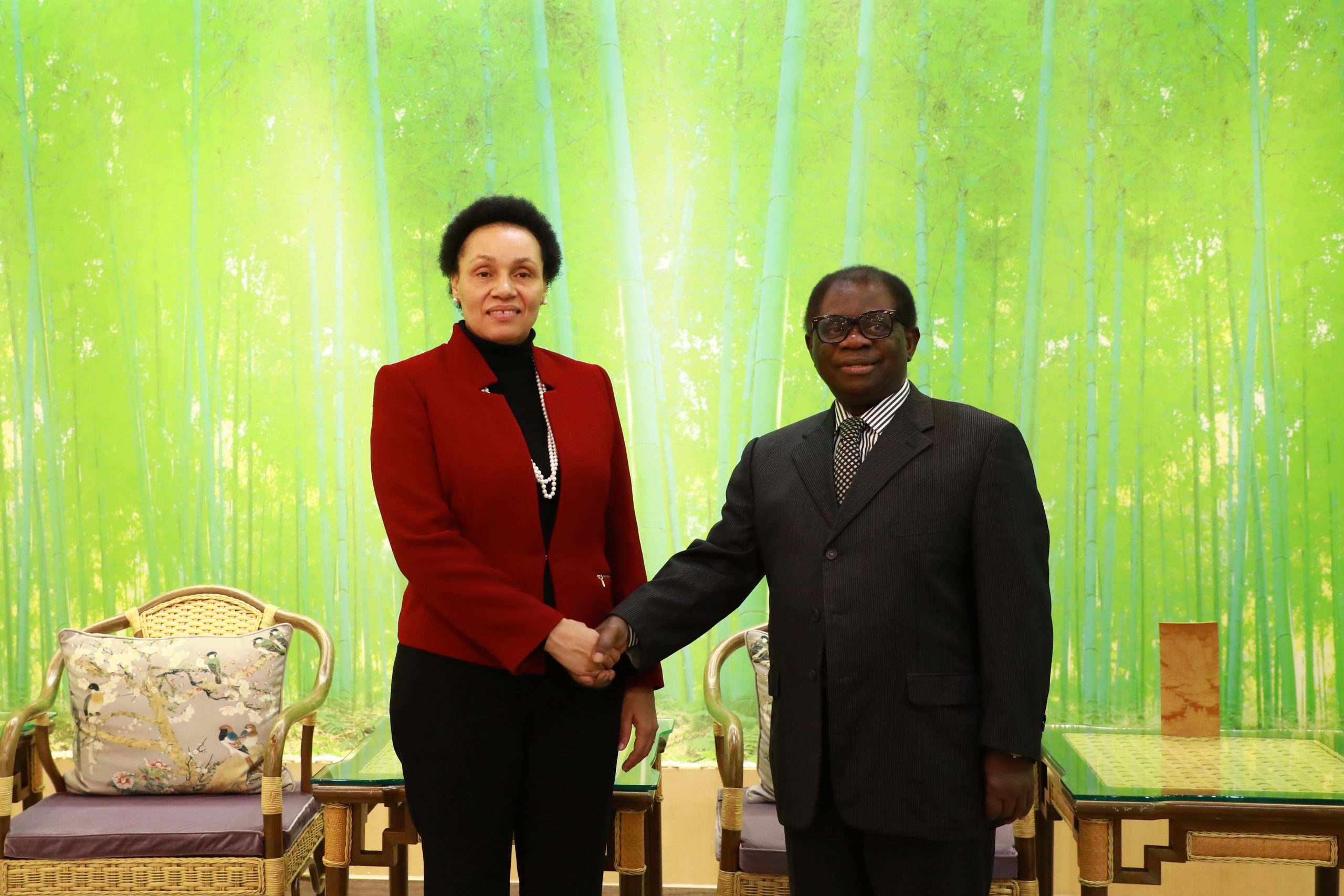 H.E. Mrs. Maria Gustava (left), Ambassador of Mozambique to China, visited INBAR HQ and held a meeting with INBAR DG (right).